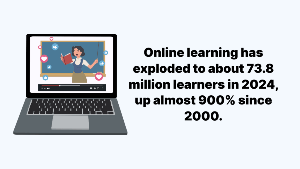 By 2024, there were approximately 73.8 million online learners worldwide, which is almost a 900% increase since 2000.